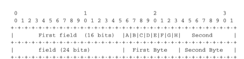 Besides 16 and 32 bit words, some applications need to exchange data structures containing bit fields of various lengths. For example, a message may be composed of a 16 bits field followed by eight, one bit flags, a 24 bits field and two 8 bits bytes. Internet protocol specifications will define such a message by using a representation such as the one below. In this representation, each line corresponds to 32 bits and the vertical lines are used to delineate fields. The numbers above the lines indicate the bit positions in the 32-bits word, with the high order bit at position 0.